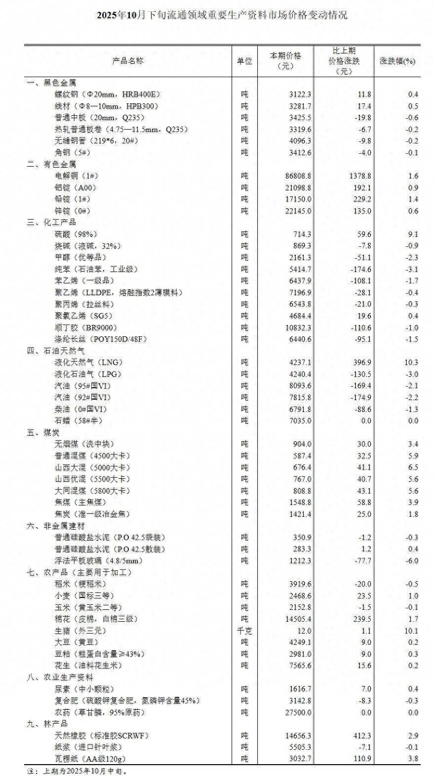 智通财经APP获悉,11月4日,据国家统计局对全国流通领域9大类50种重要生产资料市场价格的监测显示,2025年10月下旬与10月中旬相比,26种产品价格上涨,22种下降,2种持平。其中,生猪(外三元)价格环比上涨10.1%。